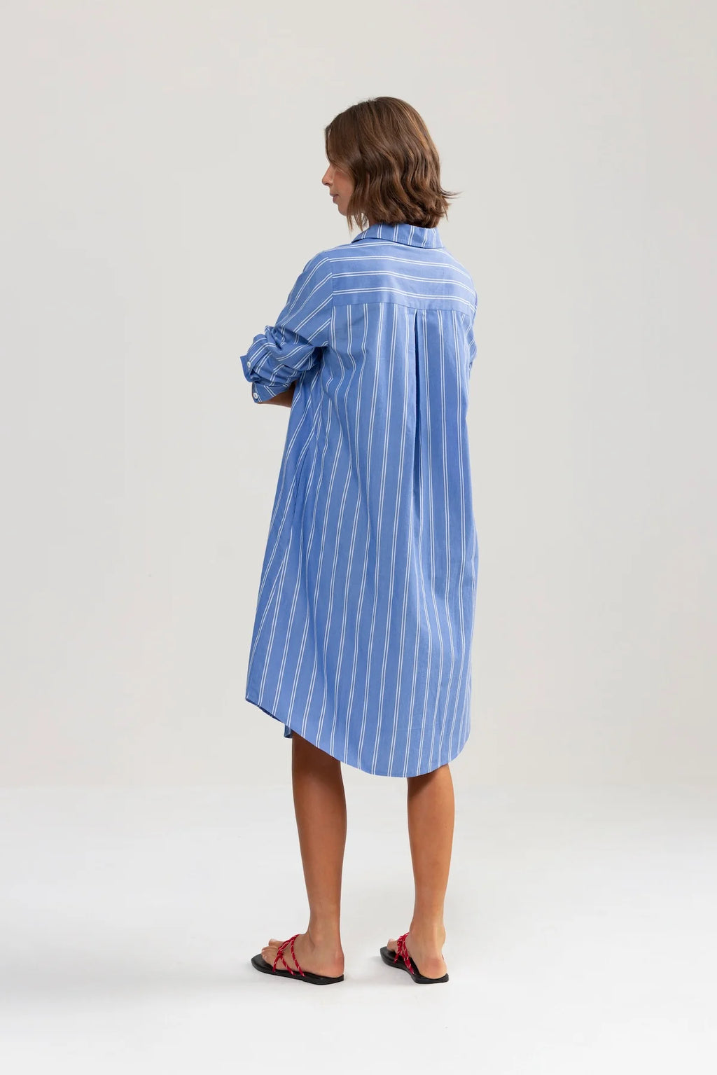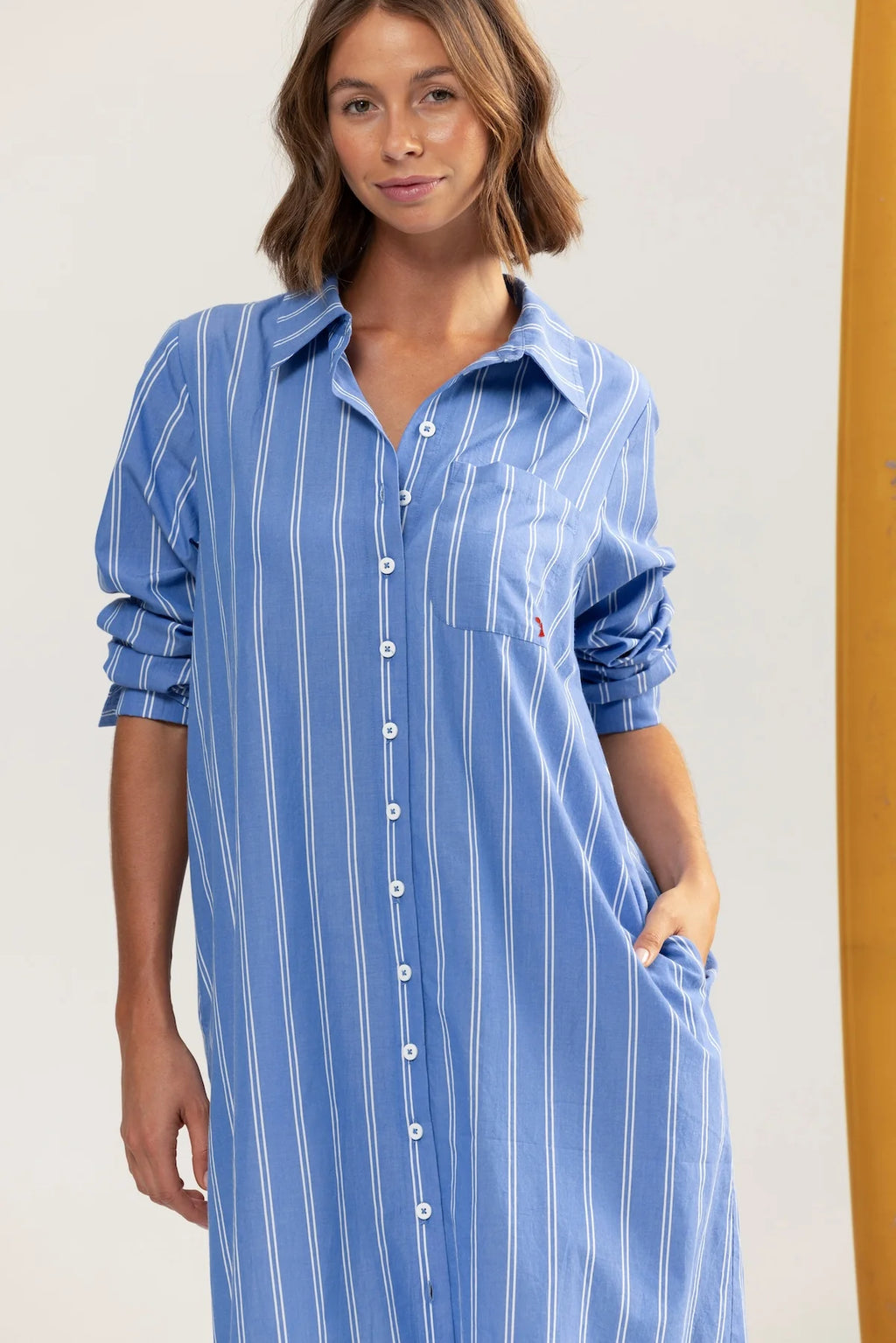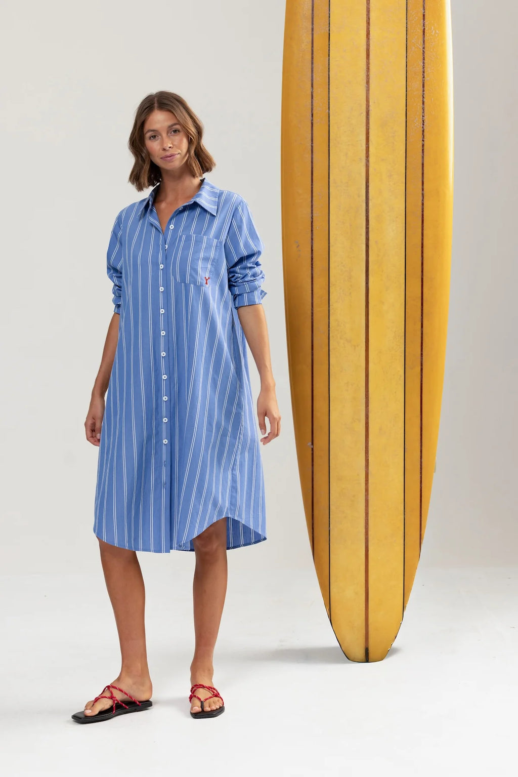 Not too oversized, with a neat fit, side pockets, and a waist tie for shape when you want it. Midi length, made for leisurely walks to lunch with your favourite ladies (or little people). Finished with a mini red embroidered lobster on the pocket, taking it delightfully into classic Binny territory.