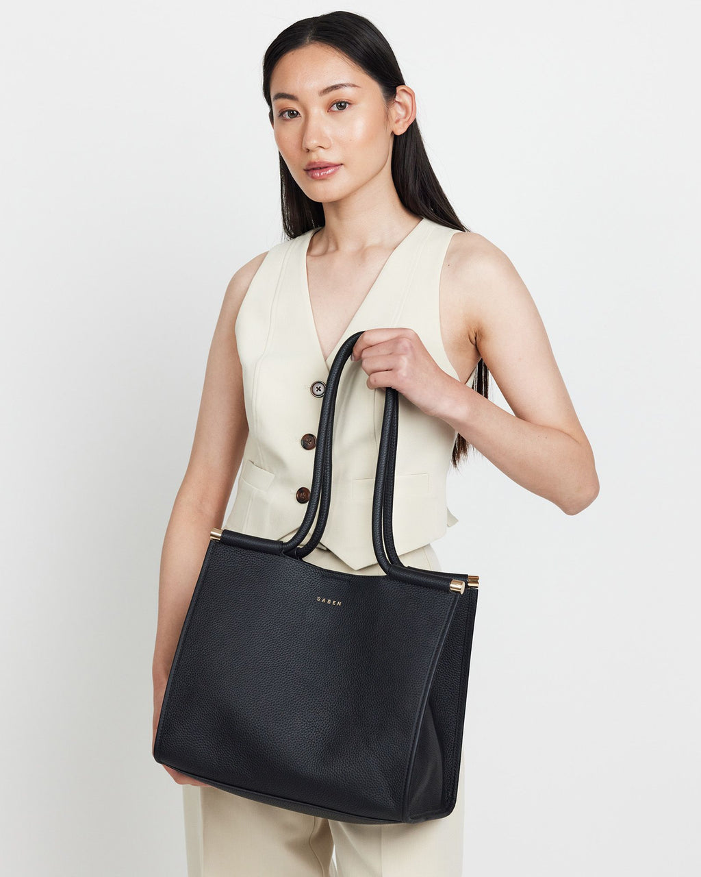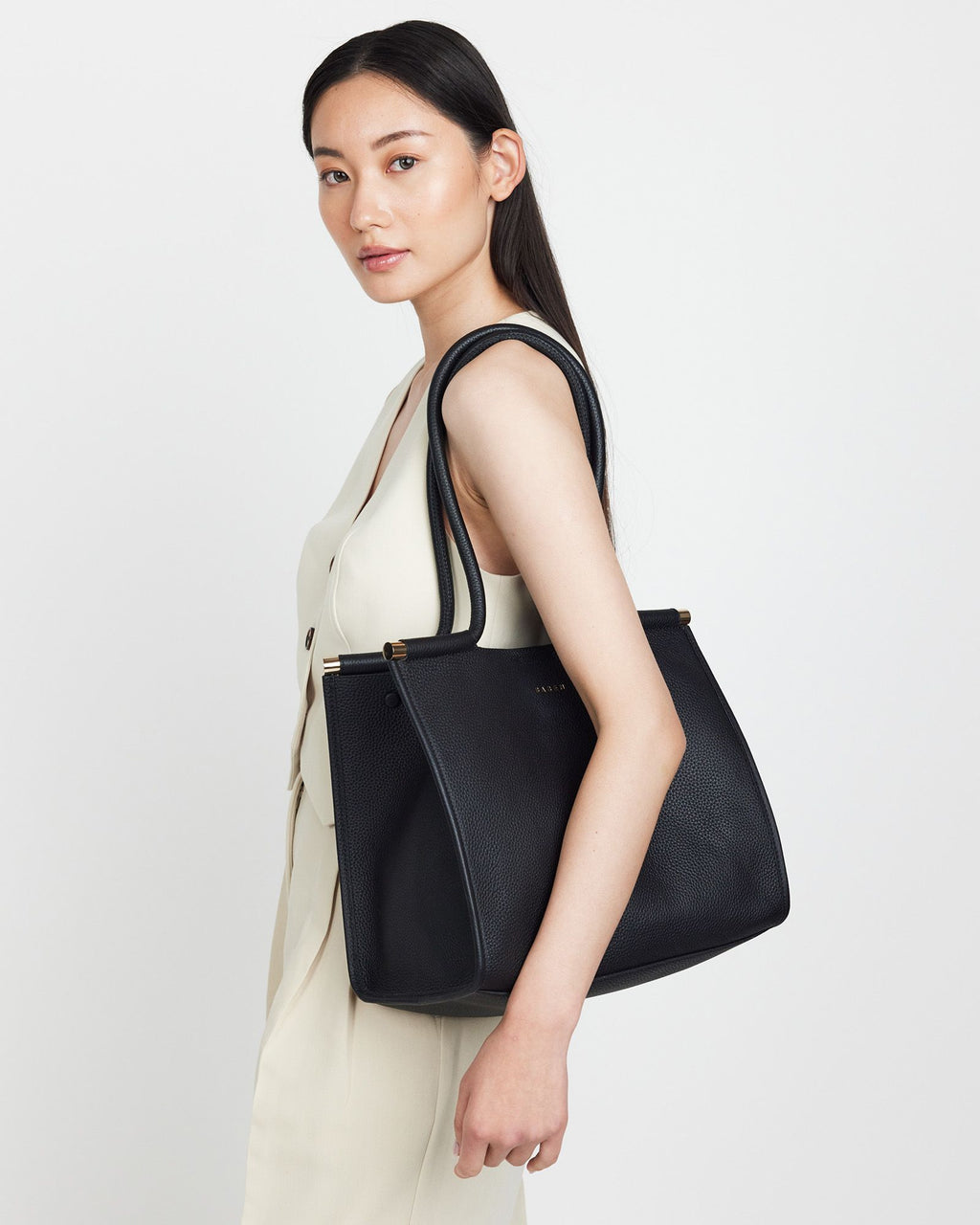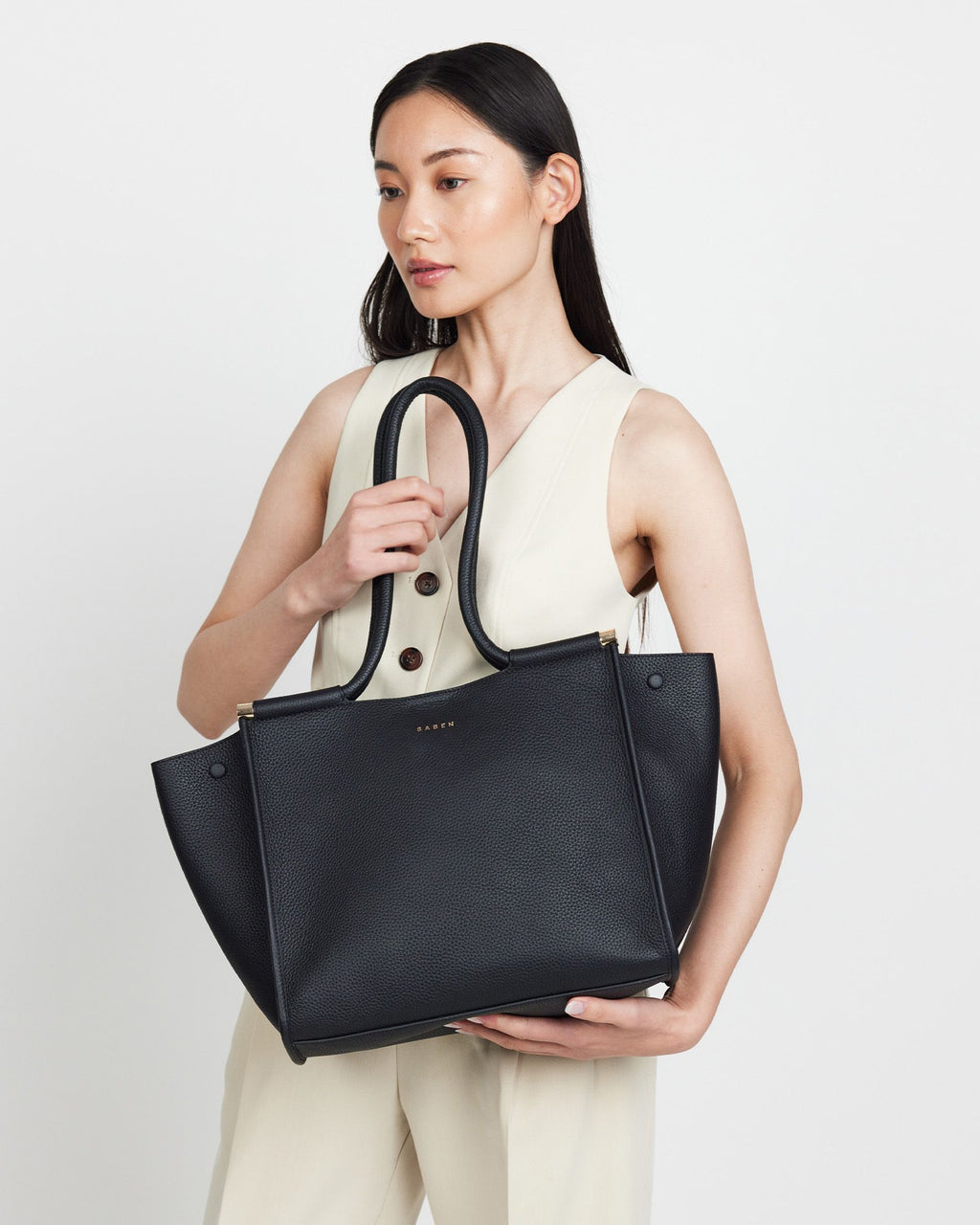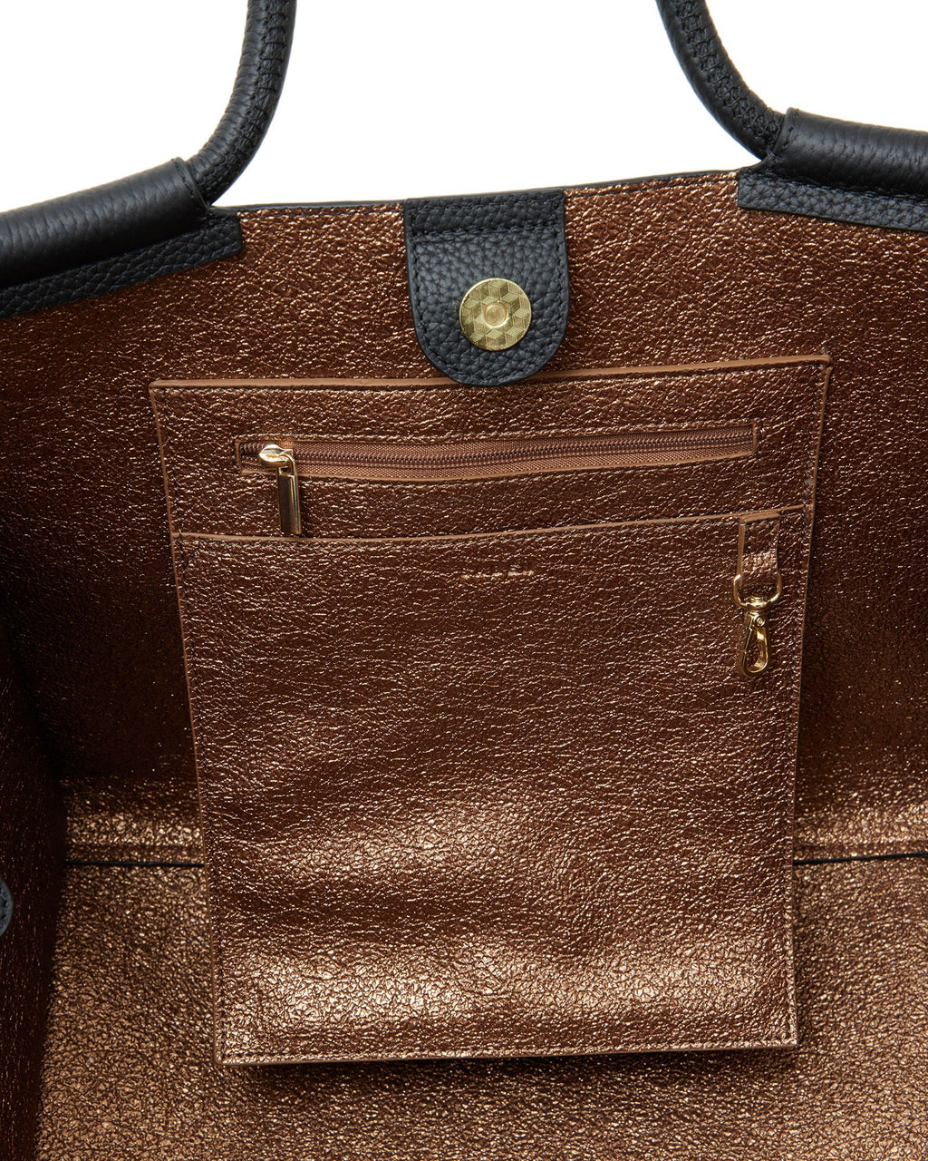 Introducing the Callie tote by Saben, a sleek minimalist tote, carefully crafted with double faced bronze leather for a surprise and delight every time you wear her. A shapeshifter by nature, Callie is designed to transform shape, allowing for the ebb and flow of your daily haul. Simply clip the sides together, bask in the bronze glow, and go!