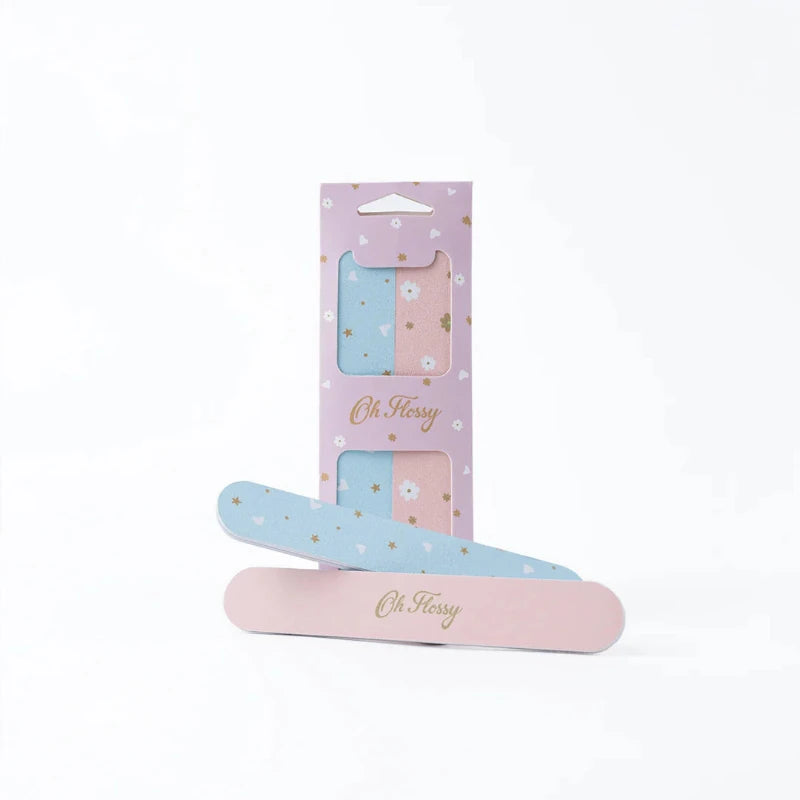 Each pack comes with a set of two (2) files.  The pink design features the signature Oh Flossy flowers and the blue design is dotted with hearts and stars.  Both are made specifically for kids, with a grit of 240/360 and sized for little hands of 12 x 2cm.