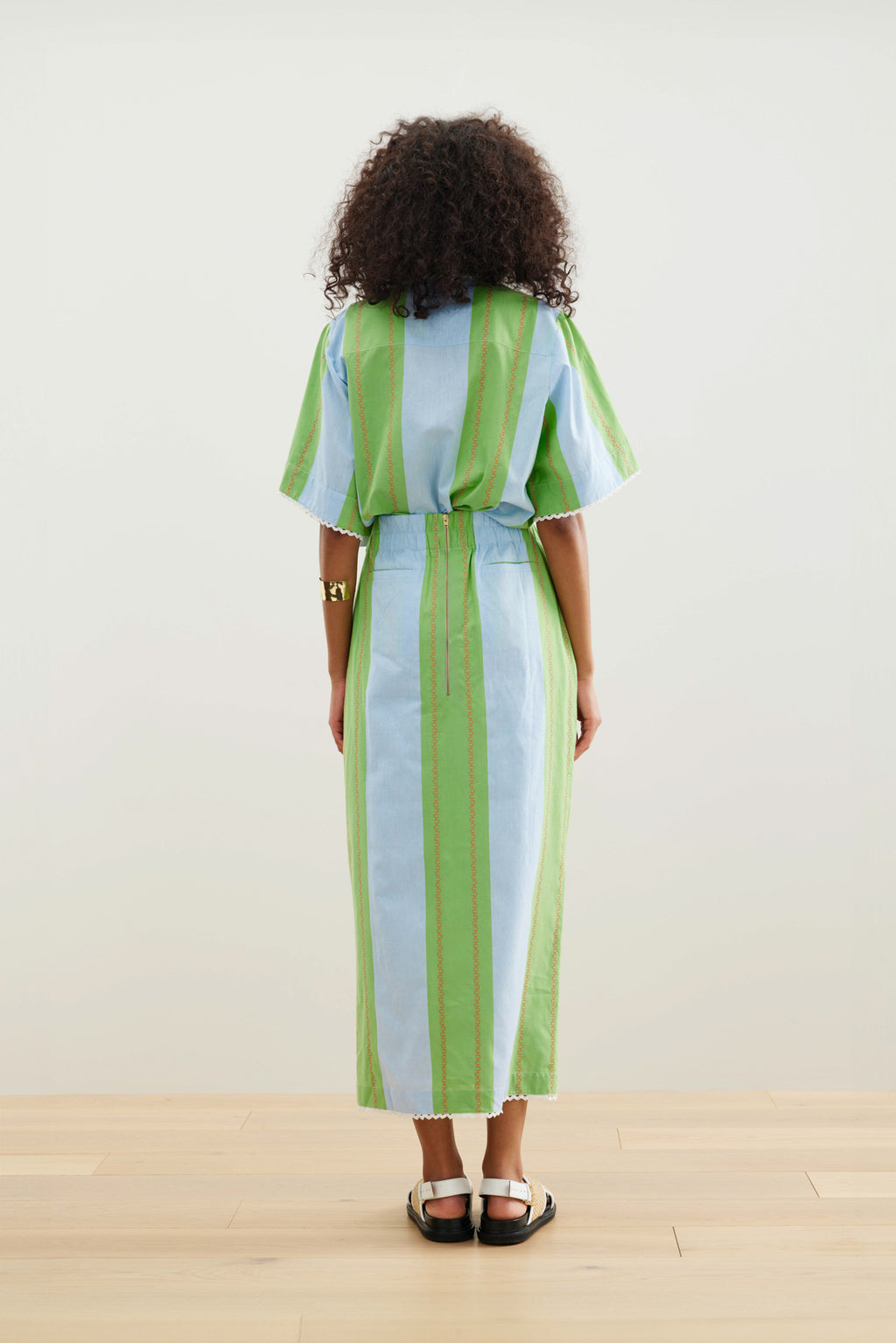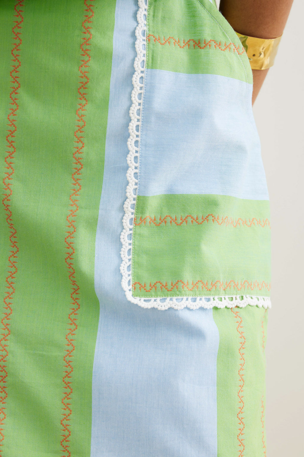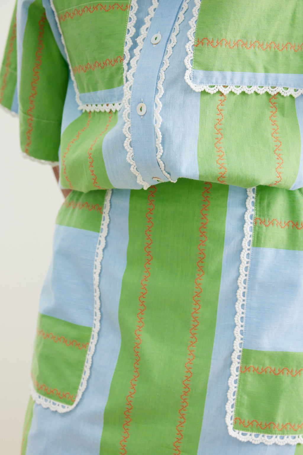 A sky blue & grass green striped pencil skirt trimmed with cotton crochet lace with front patch pockets & an elastic back.  Perfect for adding a pop of colour & personality to any outfit while staying cool and comfortable.