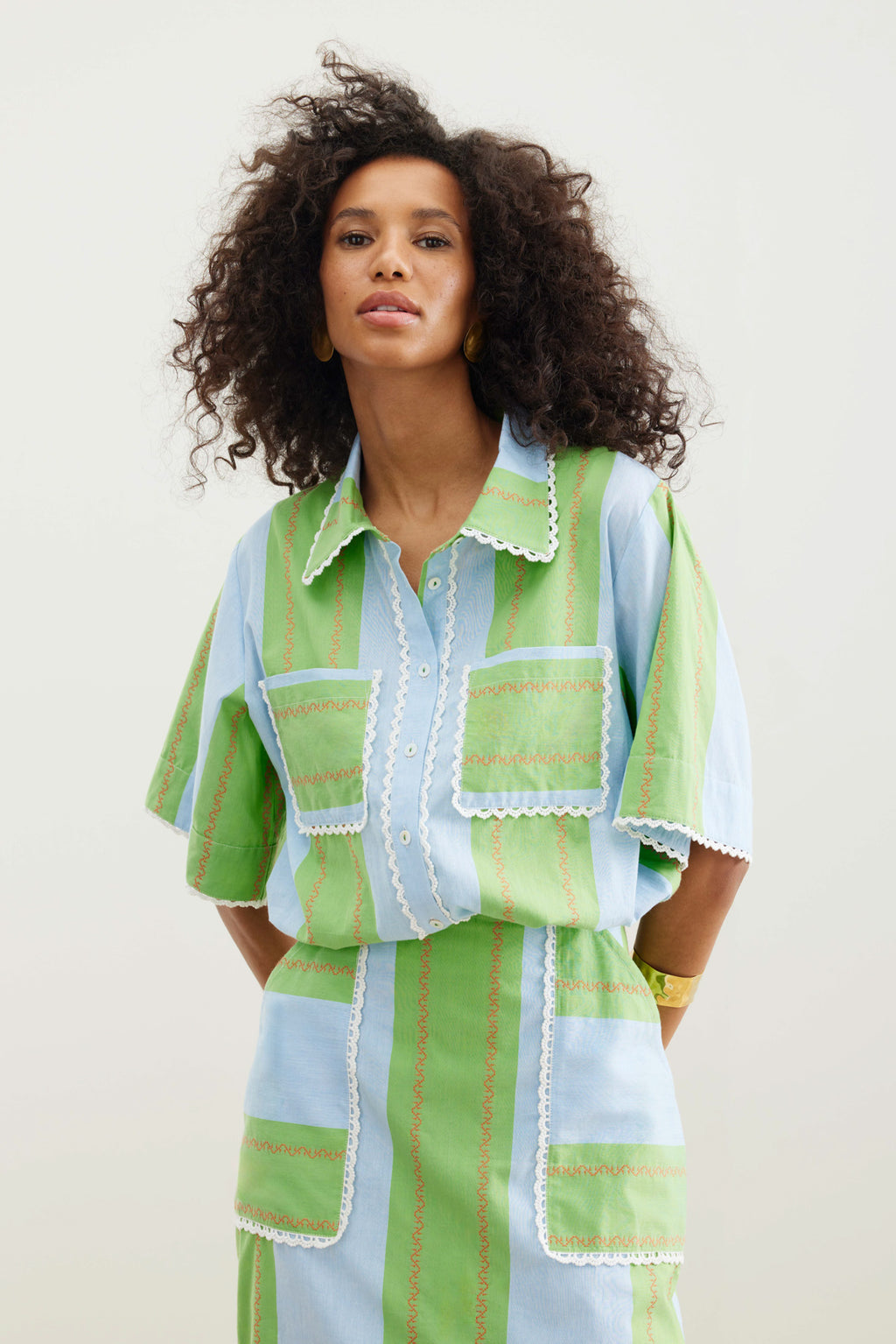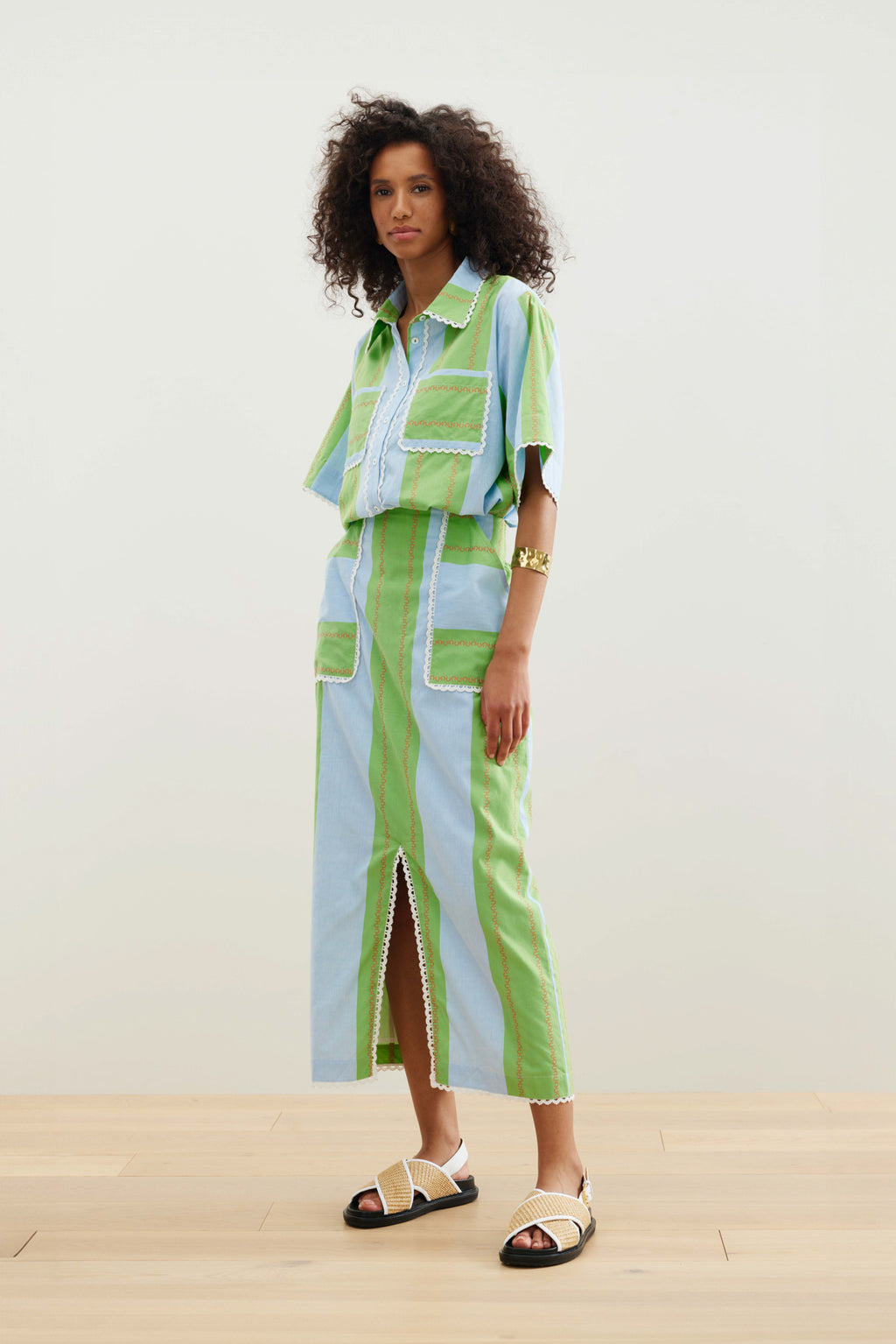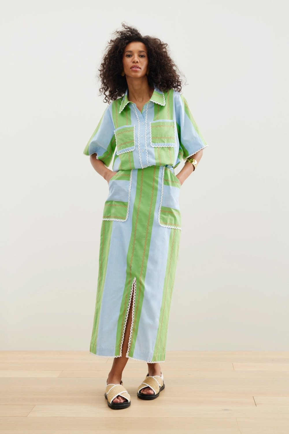 A sky blue & grass green striped pencil skirt trimmed with cotton crochet lace with front patch pockets & an elastic back.  Perfect for adding a pop of colour & personality to any outfit while staying cool and comfortable.