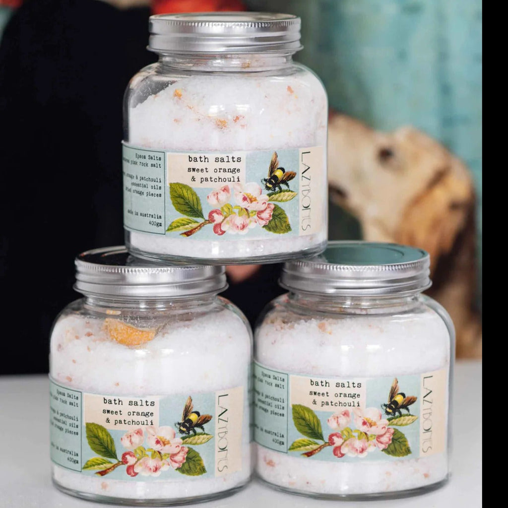 Contains Epsom Salts, Himalayan pink rock salt, Sweet Orange & Patchouli essential oil and dried orange pieces.