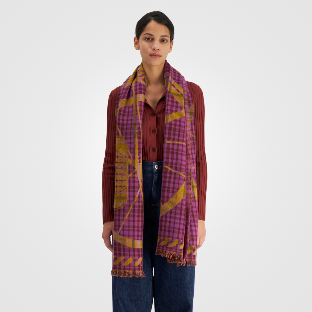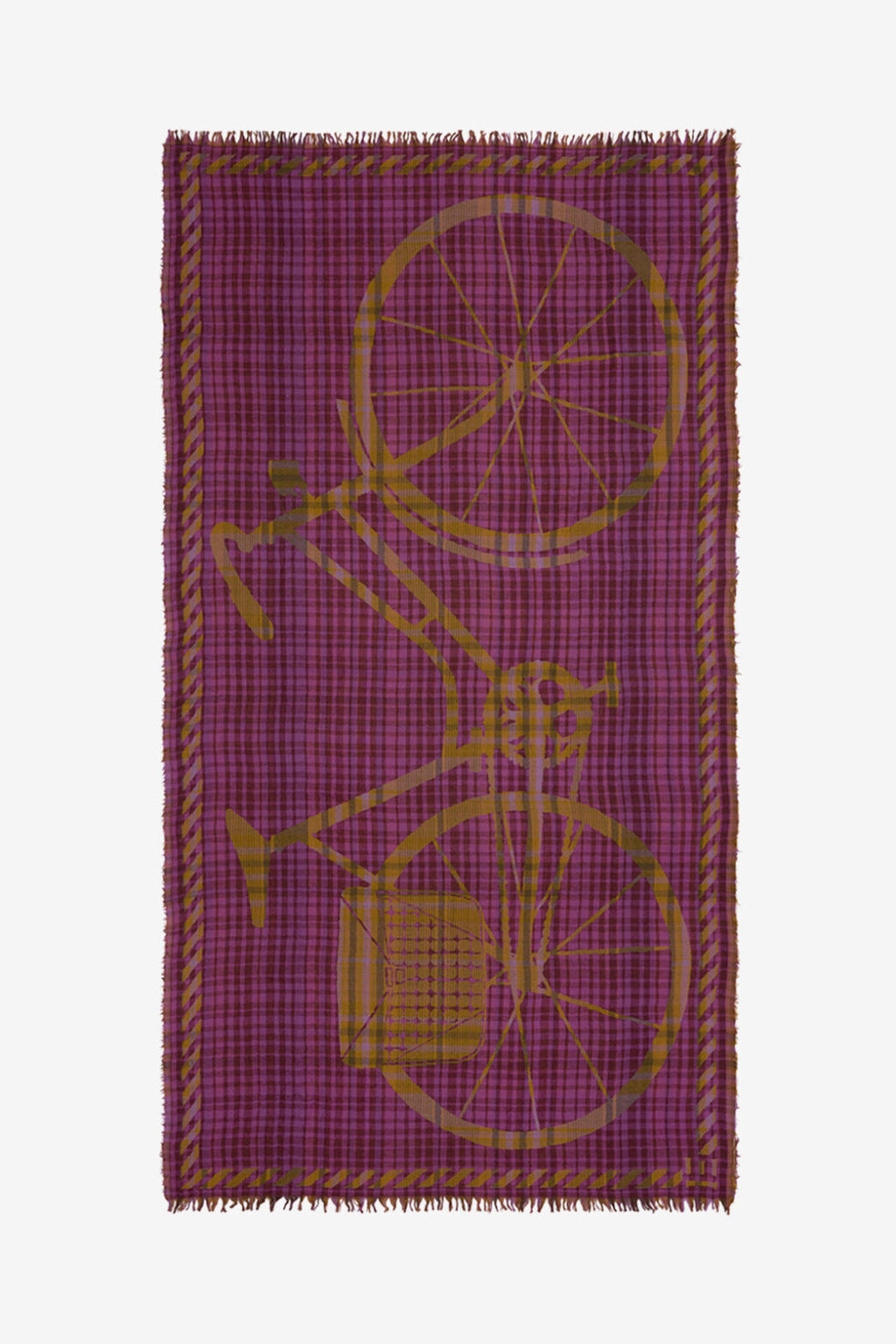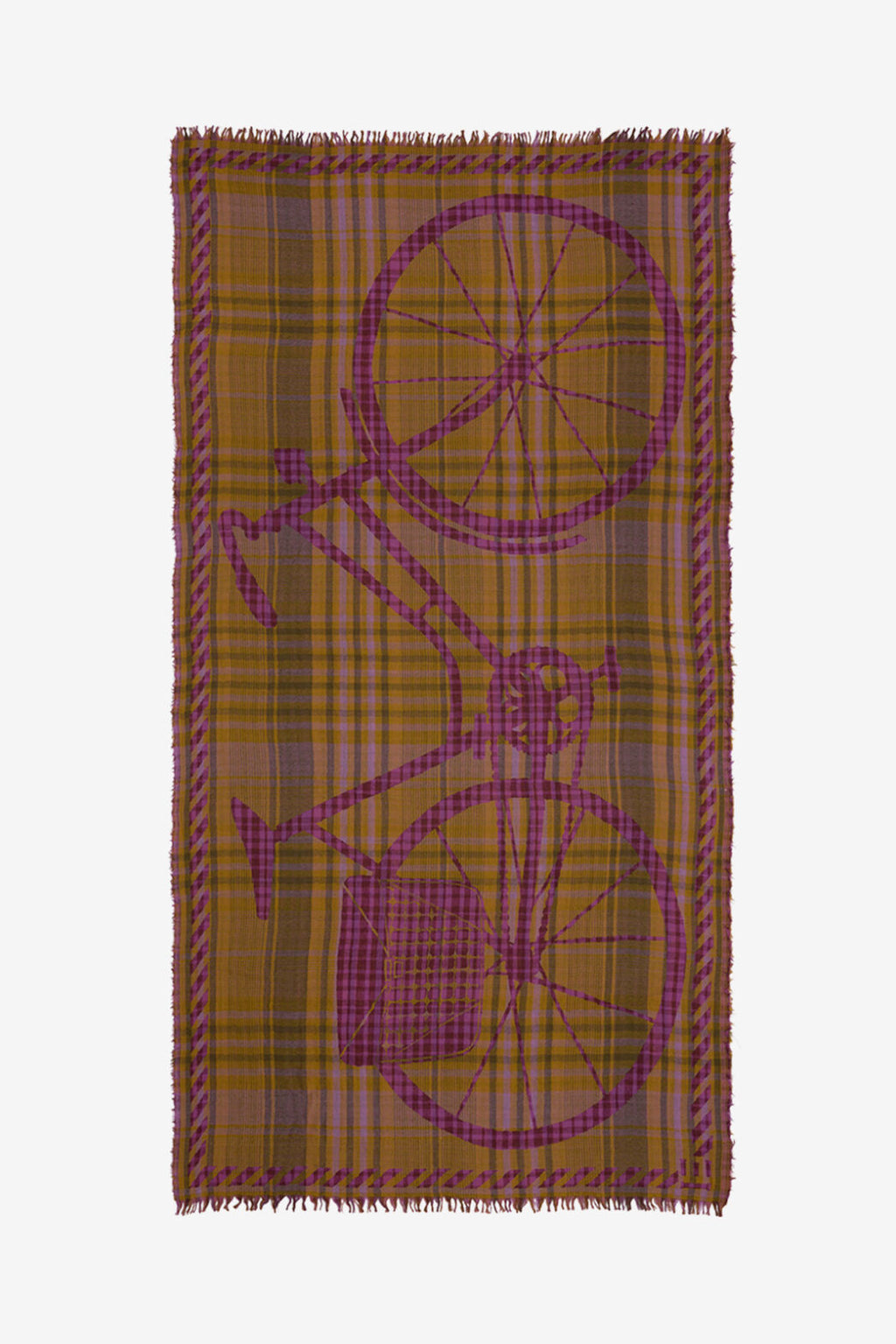 The Jacquard Poulidor Wool Scarf in pink is an elegant accessory crafted from 100% pure wool, offering both warmth and refined style. This sophisticated scarf showcases a distinctive bicycle motif designed by renowned French label Inoui Editions, artfully woven into a classic tartan background.