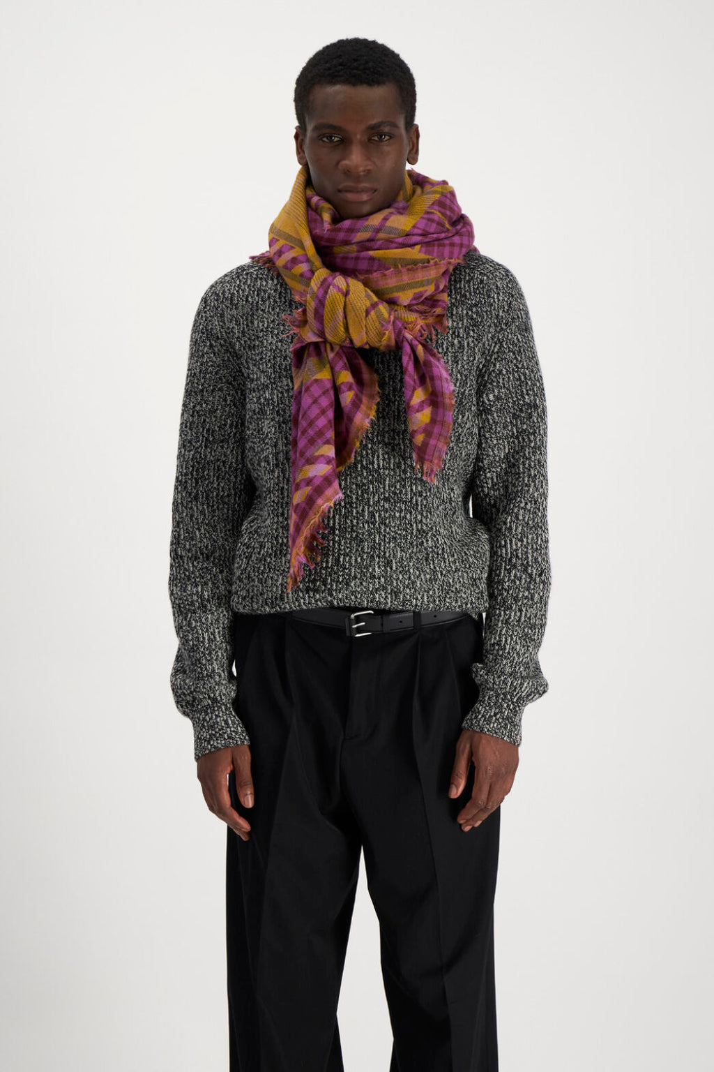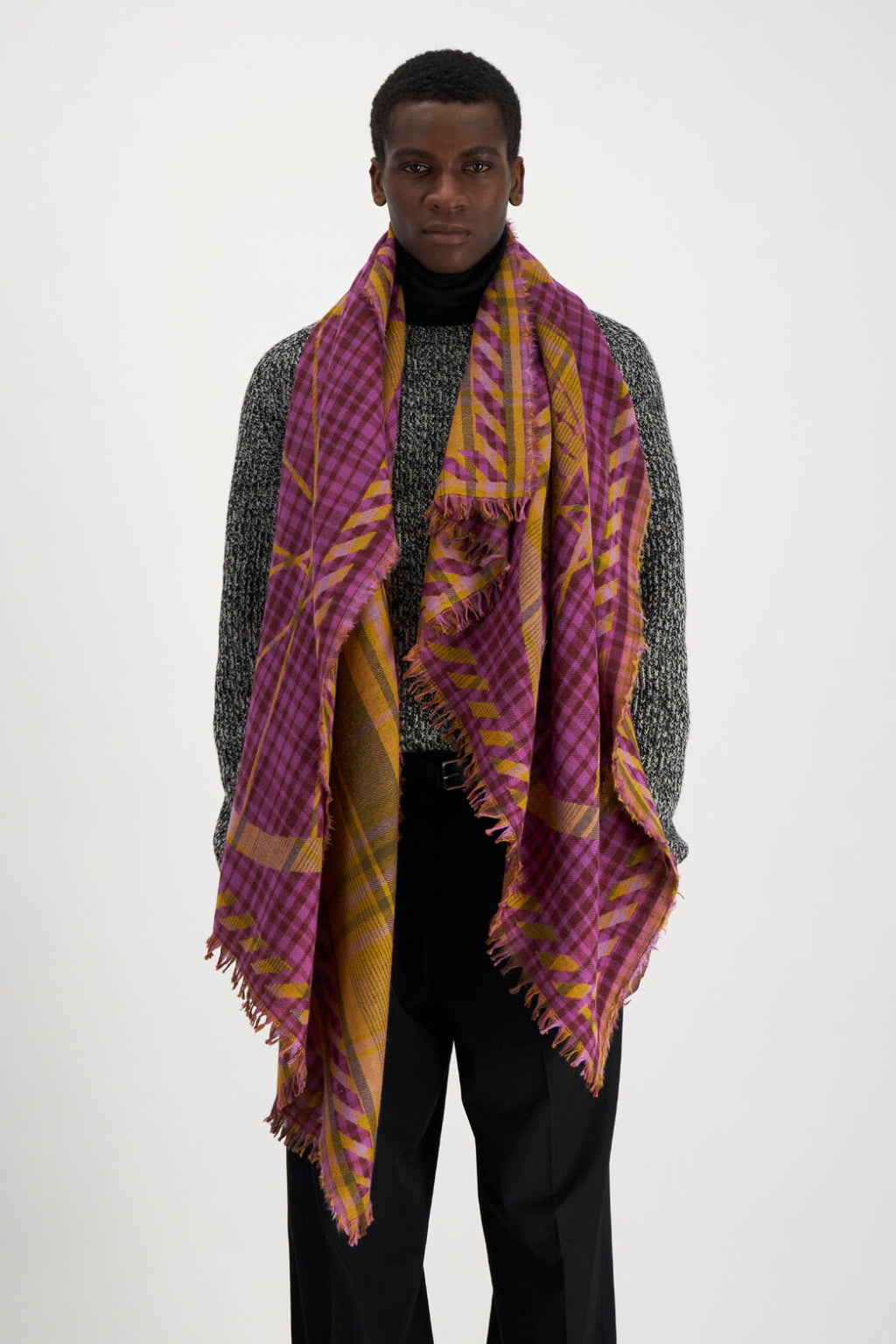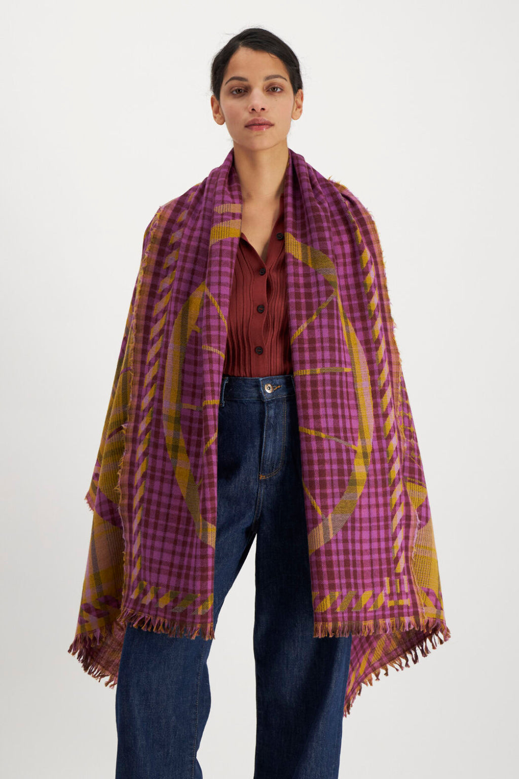 The Jacquard Poulidor Wool Scarf in pink is an elegant accessory crafted from 100% pure wool, offering both warmth and refined style. This sophisticated scarf showcases a distinctive bicycle motif designed by renowned French label Inoui Editions, artfully woven into a classic tartan background.