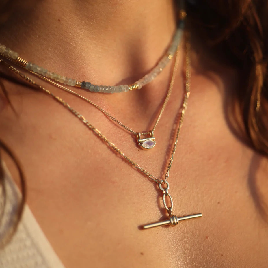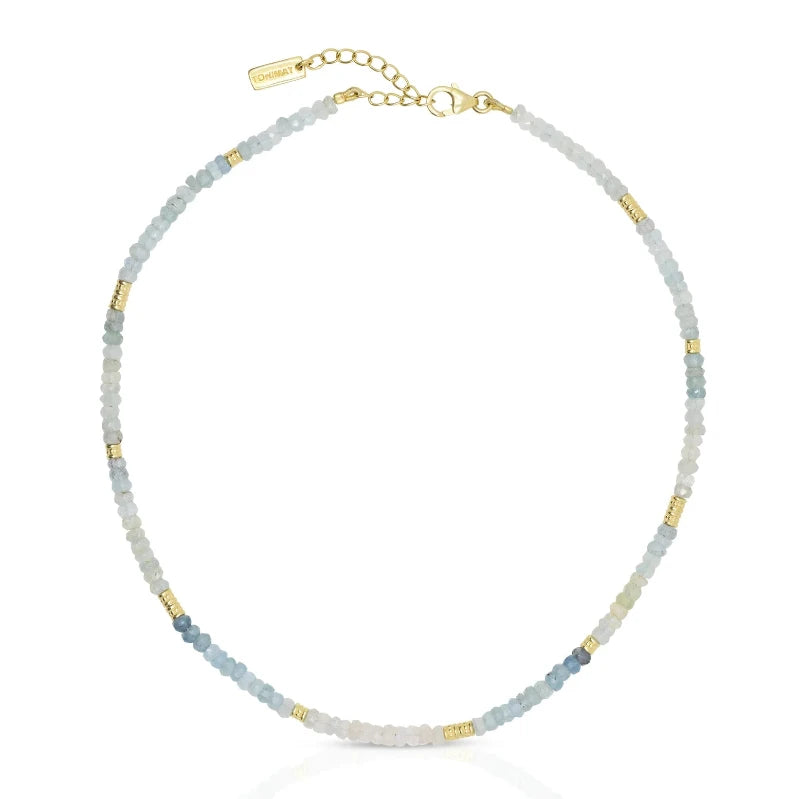 The Aquamarine Beaded Necklace features hand cut rough Aquamarine stones of varying hues woven onto the necklace and dispersed with textured gold beading.