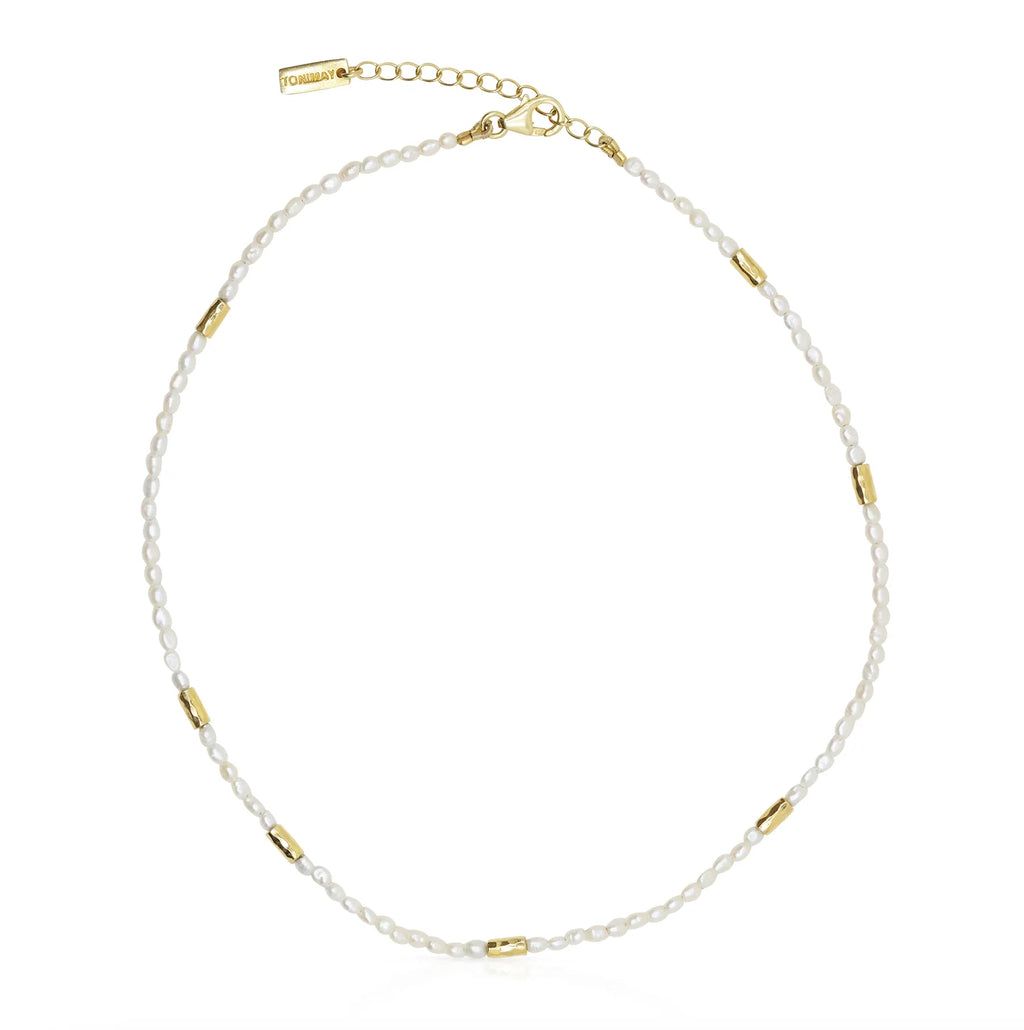 The ToniMay Pearl Necklace features natural fresh water pearls woven onto the necklace and dispersed with textured gold beading.