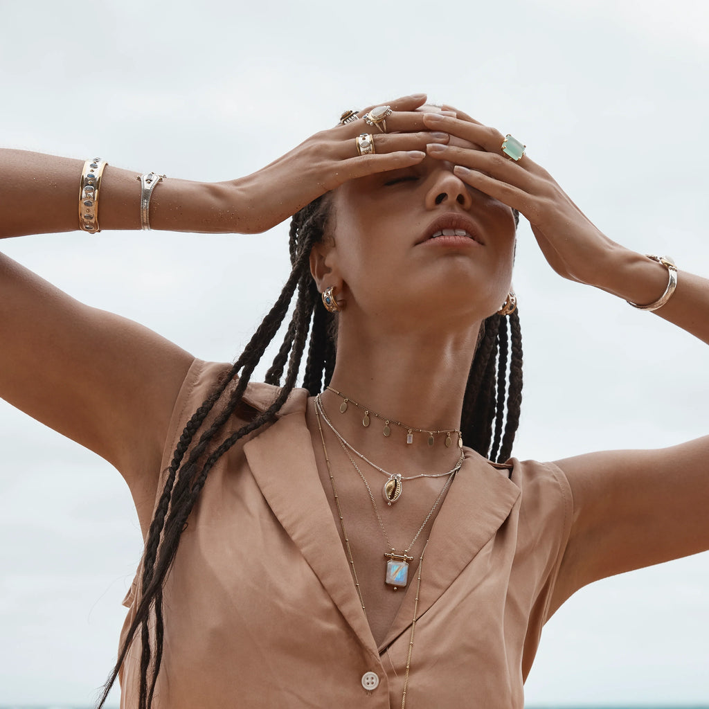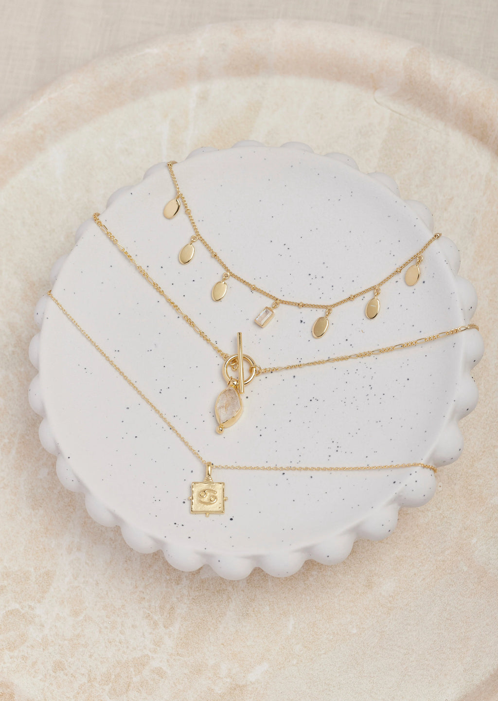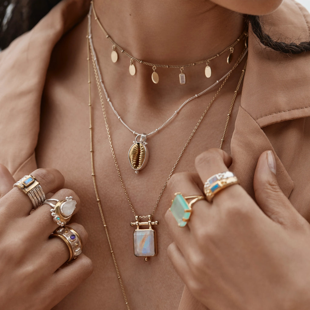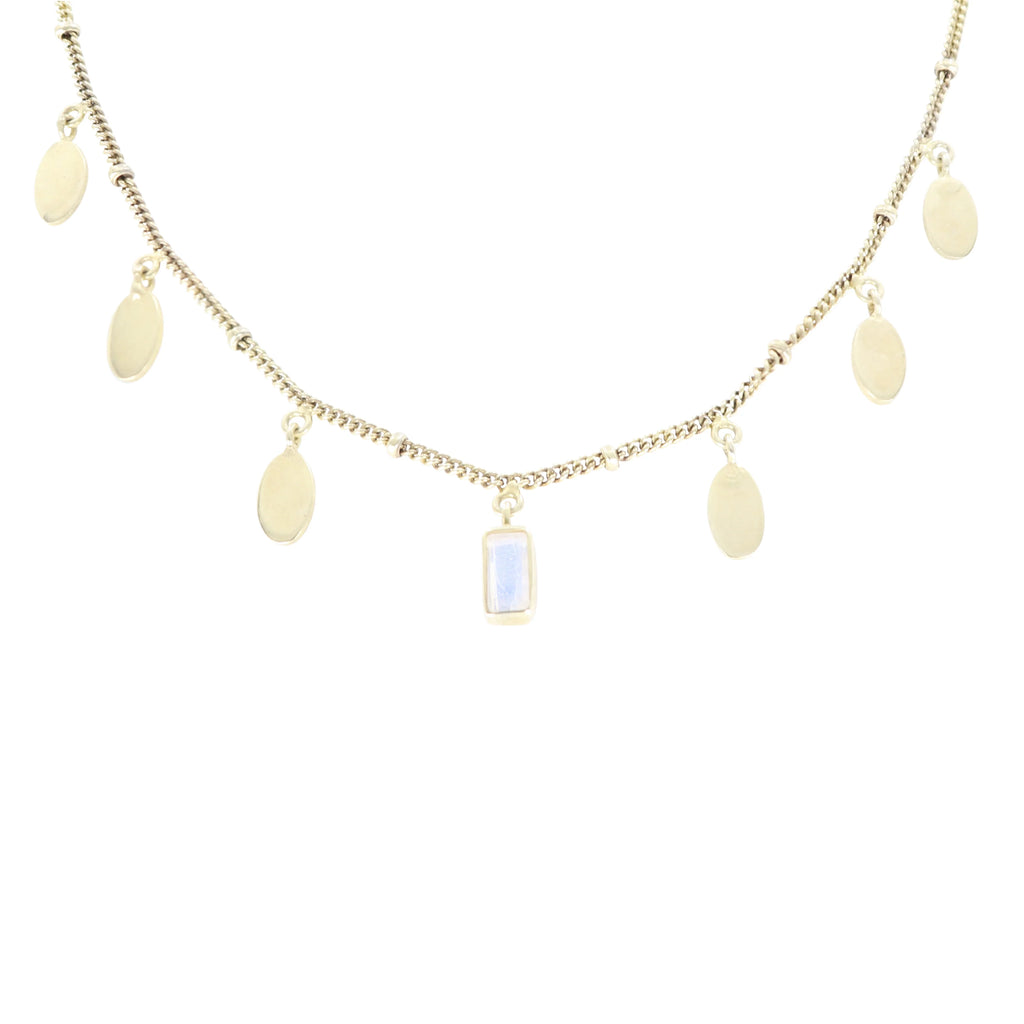 The Petal Necklace is a short necklace perfect for layering that features a baguette cut moonstone charm in it's very centre with 3 small petal charms on either side.