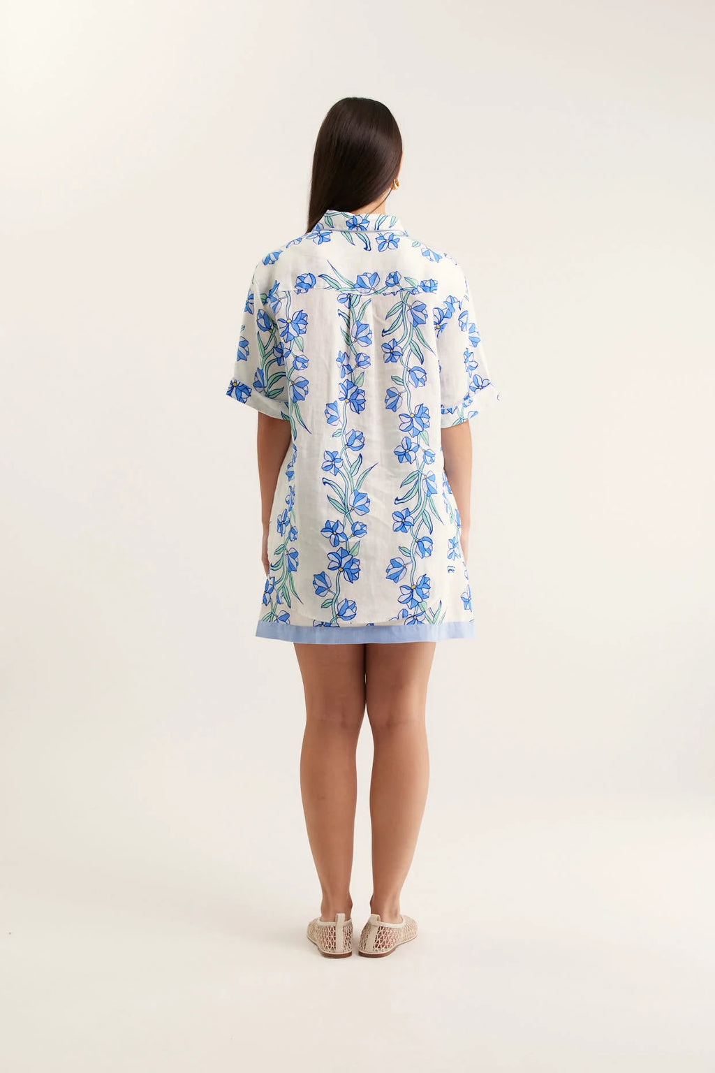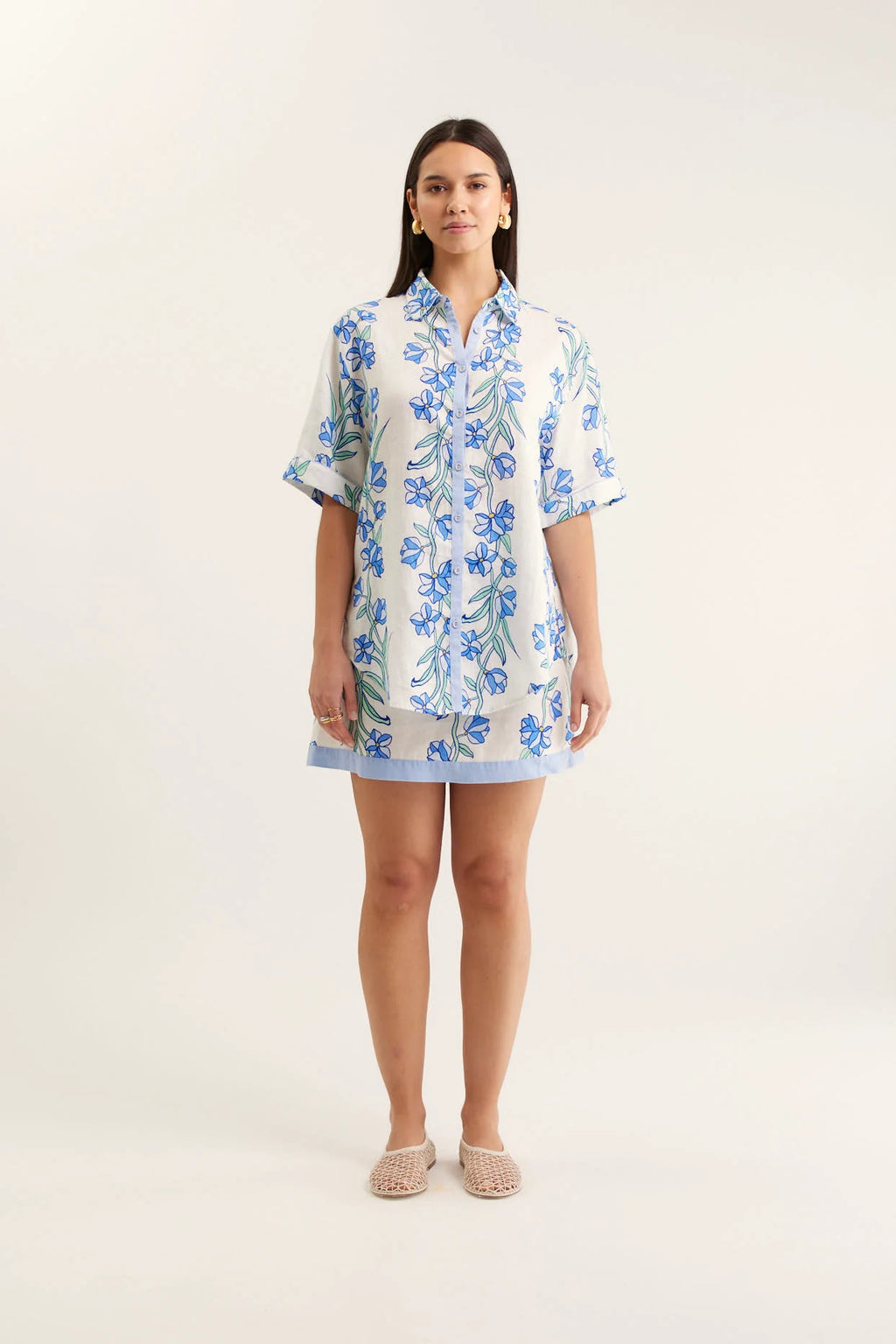 Brighten up your wardrobe with the effortlessly cool Sasha Linen Shirt by Alessandra. Crafted from breathable 100% linen, this collared shirt features a vibrant blue floral vine print that brings a fresh, feminine touch to a boxy, modern silhouette.