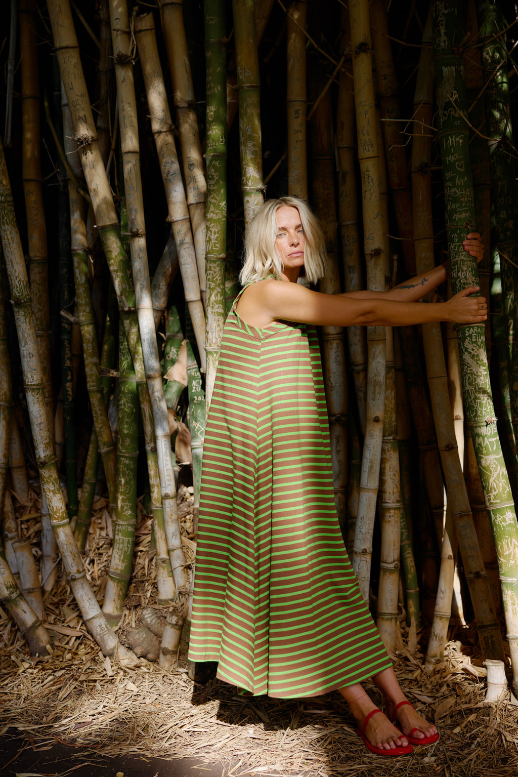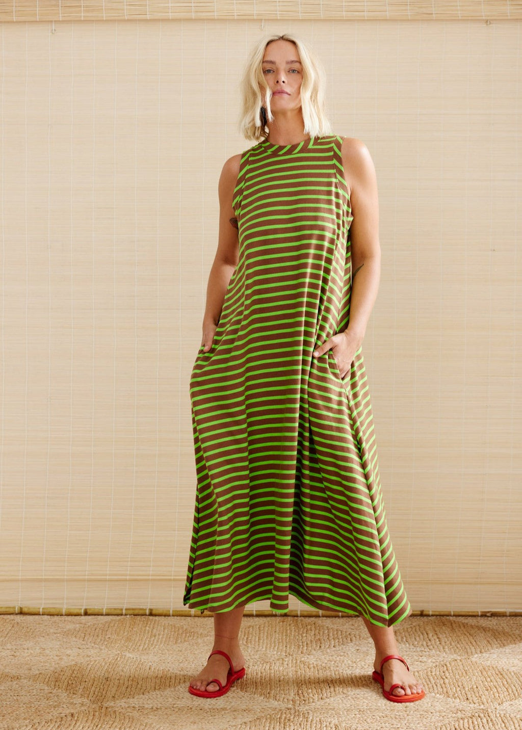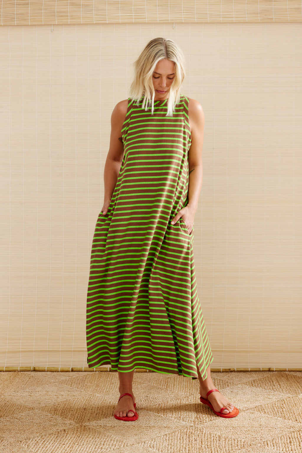 The SwahiliI Tank Dress from Binny sports cool brown and green stripes which are not only on trend but supremely practical to get you through the day. Just add a tan oversized barn jacket, raffia market bag & aviators with the french leather sandals. Tres Chic!