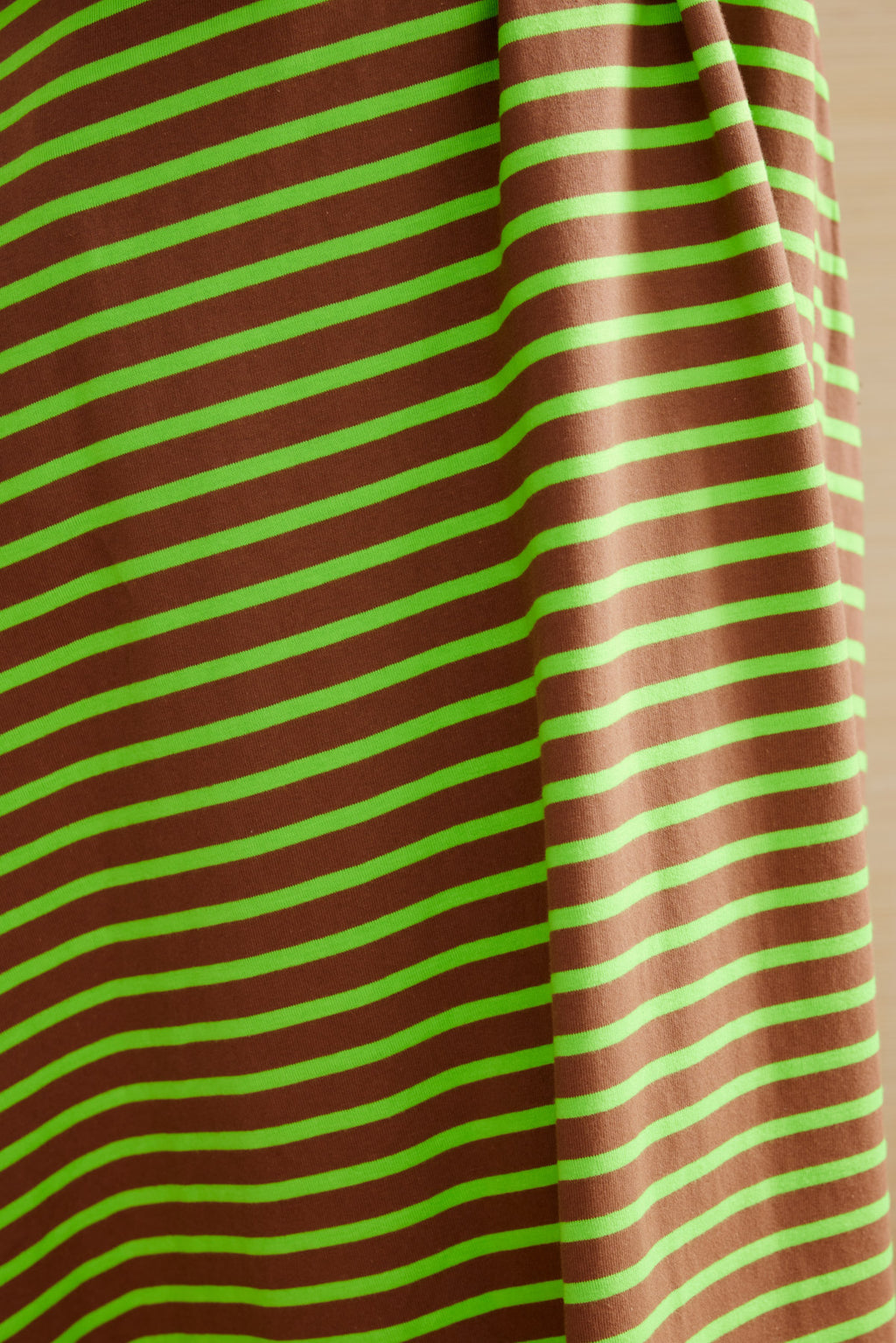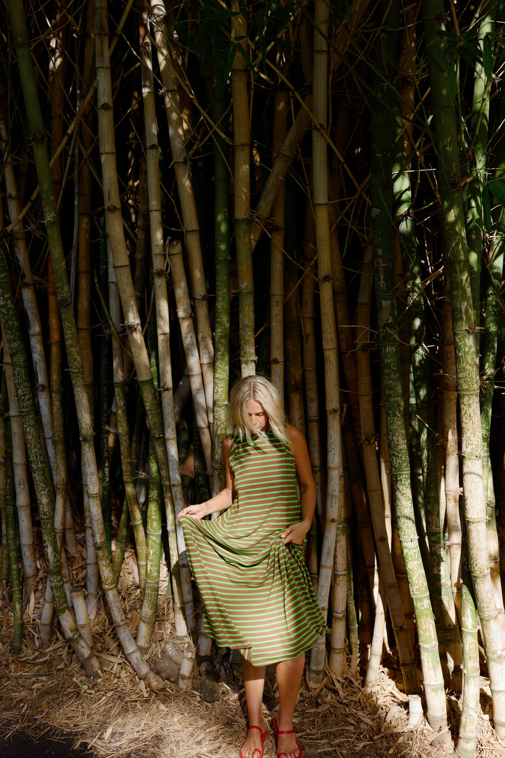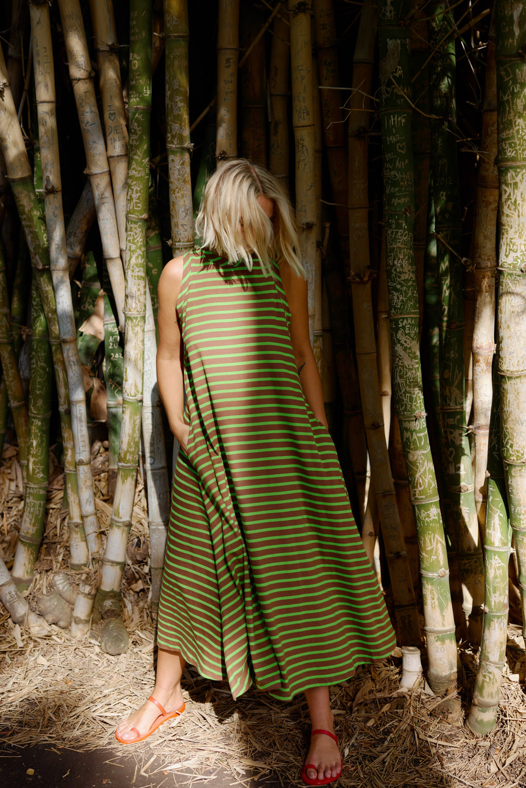 The SwahiliI Tank Dress from Binny sports cool brown and green stripes which are not only on trend but supremely practical to get you through the day. Just add a tan oversized barn jacket, raffia market bag & aviators with the french leather sandals. Tres Chic!